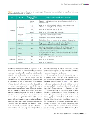 Tabla 1. Eventos que ilustran algunas de las transiciones evolutivas más importantes hacia los mamíferos modernos,
