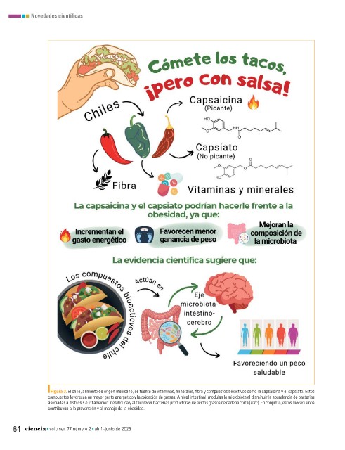 ■Figura 3. El chile, alimento de origen mexicano, es fuente de vitaminas, minerales, fibra y compuestos bioactivos como la capsaicina y el capsiato. Estos