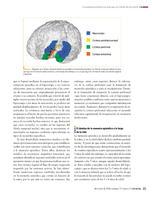 ■Figura 1. Regiones en el lóbulo temporal medial involucradas en la memoria episódica. Las flechas continuas indican el curso