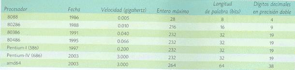 Cuadro 1. Dígitos de precisión decimal para operaciones con números enteros con respecto de la velocidad y tamaño de palabra.