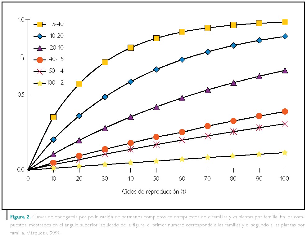 Los resultados de un estudio de Márquez (1992) sobre la endogamia en los sintéticos mostraron que mientras mayor era el número de líneas (de 2 a 1) la reducción de la endogamia era de casi 0 a 80 por ciento para cualquier grado de endogamia de las líneas, mientras que si se aumentaba el número de plantas por línea (de 1 a 10), las reducciones eran de 90 por ciento para plantas no endogámicas, 45 por ciento para líneas fraternales, 50 por ciento para líneas S1 y 0 por ciento para líneas homocigóticas. |