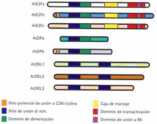 | Figura 1. Organización estructural y propiedades de la familia de E2F en Arabidopsis. En la familia de E2F se conservan los dominios de unión al ADN, de dimerización, de caja de marcaje y el dominio de transactivación. Basado en la conservación de los diferentes dominios, las ocho proteínas de E2F de Arabidopsis son clasificadas en E2F, DP y DEL. |
