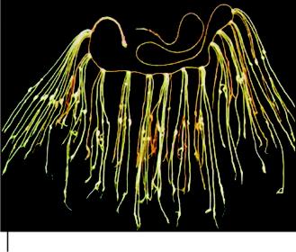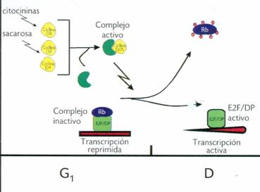Una ruta análoga de E2F/pRb en la transición G1-S del ciclo celular, que involucra la fosforilación de pRb por los complejos CDK/ciclina y la liberación de E2F, ha sido dilucidada recientemente en células vegetales, y probablemente los mecanismos de su regulación sean los mismos que en sus contrapartes en humanos y otros eucariontes superiores (Figura 2). Aunque no se han encontrado homólogos de las ciclinas E en plantas, fundamentales en la transición G1-S en animales, las ciclinas tipo A o quizá algunas del tipo D podrían participar en la regulación de la transición G1-S y de G2-M del ciclo celular (Wen-Hui Sen, 2001). |