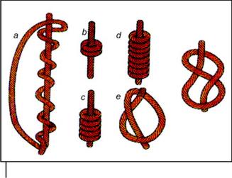 Figura 2. Se muestran los tres tipos de nudos: largos (a partir de dos enrollamientos hasta nueve, a-d, en donde a es un nudo largo no apretado), simples (de potencias de 10, e), y en forma de ocho (para una sola unidad aislada, f).