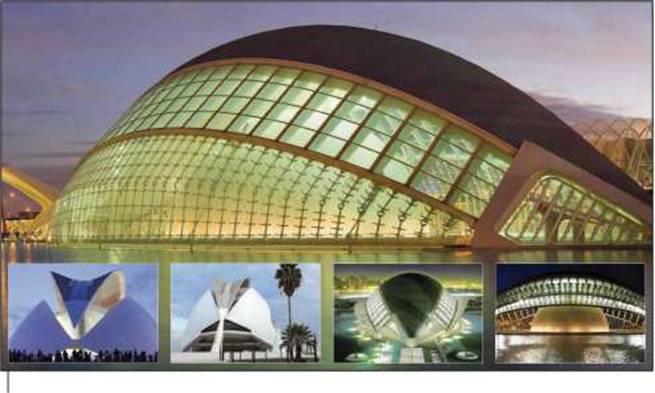 La Ciudad de las Artes y las Ciencias, en Valencia (España), ciudad que hace honor a su nombre por sus contenidos. Se trata de un espacio público en el que los arquitectos Santiago Calatrava y Félix Candela despliegan sus saberes técnicos y artísticos. |