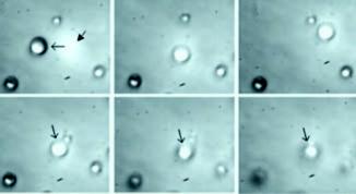 Figura 2. Manipulación en tres dimensiones de una esfera de vidrio de 5 micrómetros suspendida en agua. (a) Se observa la imagen transversal del haz de luz proyectada en el plano de la muestra; (b) el haz se ha dirigido hacia una partícula atrapándola; en (c) se puede ver cómo ésta se ha desplazado lateralmente a otra posición respecto a sus vecinas. En las imágenes (d-f) la partícula señalada con la flecha es la que está atrapada y el resto de las microesferas se desenfocan, lo cual indica que la partícula atrapada se está desplazando en la dirección vertical. |