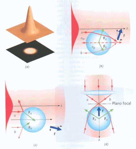 A pesar de estos avances, las aplicaciones de las técnicas de captura óptica aún se veían bastante limitadas. Sin embargo, en 1986 se obtuvo otro gran avance en el área, nuevamente debido a Ashkin y a sus colaboradores, entre los que destaca Steven Chu, premio Nobel de física 1997 por sus contribuciones al enfriamiento y captura de átomos con luz. Esta vez desarrollaron una "trampa óptica" muy estable, que permitía atrapar firmemente a una partícula utilizando un solo haz de luz. Para lograr esto, el haz se debe enfocar en un área extremadamente pequeña utilizando una lente objetivo de microscopio (de manera análoga a como se enfoca la luz del Sol mediante una lupa). Con ello se genera un considerable gradiente de intensidad en la dirección de propagación, además del transversal. Como consecuencia, la fuerza de gradiente atrae a las partículas hacia la región focal, donde la intensidad es máxima. Lo sorprendente es que esta fuerza tiene magnitud suficiente como para equilibrar el peso de la partícula y la fuerza de esparcimiento, de modo que las partículas pueden ser atrapadas aun cuando el haz se dirija verticalmente hacia abajo. Este tipo de trampa se conoce hoy en día como "pinzas ópticas", y su eficacia se ha comprobado con partículas cuyos tamaños van desde decenas de nanómetros (millonésimas de milímetro) hasta decenas de micrómetros (milésimas de milímetro). El principio de operación en este caso se ilustra en la Figura 1d. Las fuerzas ejercidas por los rayos a y b sobre la esfera corresponden a Fa y Fb, respectivamente, y la fuerza total apunta en dirección del plano focal (flecha azul).