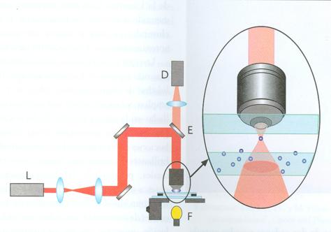 Figura 3. Un arreglo experimental simple de pinzas ópticas. El láser (L) se dirige mediante un conjunto de espejos hacia el objetivo de microscopio que se utilizará para enfocarlo. El último espejo (E) es selectivo, de manera que refleja la luz del láser pero permite observar la muestra a través de la iluminación de fondo (F) y un sistema de detección (D), que típicamente consiste de una cámara. La muestra se encuentra sobre una base de traslación que permite su movimiento relativo al haz de luz.