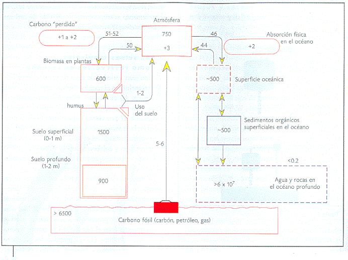 Figura 2. Ciclo global del carbono. Los valores adjuntos a las flechas determinan el valor de los flujos entre reservorios en petagramos de carbono/año de flujo neto, y los valores dentro de los cuadros representan el tamaño de los reservorios, en petagramos de carbono por reservorio. Nota: el cambio en el uso del suelo y la cantidad de carbono perdido son similares (modificado de Körner, 2000). Un petagramo equivale a mil millones de toneladas. |