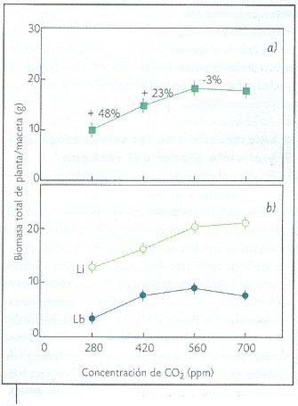 Figura 4. Respuesta asintótica de las plantas al incremento atmosférico de dióxido de carbono. Li = Luz intensa; Lb = Luz baja. a) Biomasa total promedio e incremento porcentual entre nivel es de dióxido de carbono; b) Biomasa total promedio por condición de luz (modificado de Granados y Körner, 2002). |