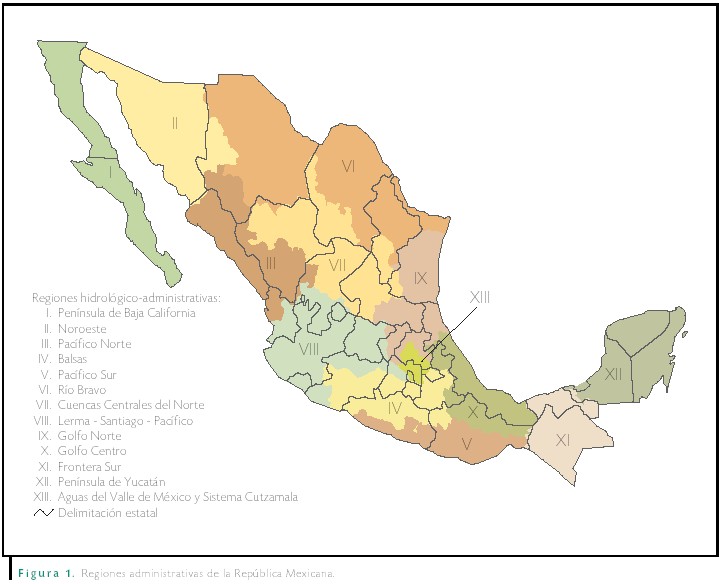 Las regiones administrativas son áreas territoriales definidas de acuerdo con criterios hidrológicos y geológicos, y cada una de ellas está constituida por una o varias cuencas hidrológicas. La República Mexicana se ha dividido en 13 regiones administrativas. En la Figura 1 se indican sus límites geográficos, establecidos por la Comisión Nacional del Agua (CNA, 2005).