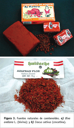 Existen carotenoides cuya fuente exclusiva son plantas y no microorganismos; entre ellos se encuentran la bixina del achiote, la crocetina del azafrán, la capsantina de especies de chiles y la zeaxantina del maíz (Zea mays). El contenido de bixina fluctúa entre 1 y 6.9 por ciento del peso seco de la semilla de achiote; la capsantina representa cerca de 587.7 microgramos por gramo de peso fresco de Capsicum, la zeaxantina puede alcanzar entre 0.6 y 71.9 microgramos por gramo de peso fresco del maíz, y se requieren de 4 mil estigmas para obtener 25 gramos de azafrán. También se pueden obtener otros carotenoides en abundancia de otras especies vegetales, como la luteína de los pétalos de la flor del cempasúchil, en los que puede alcanzar hasta 5 mil 700 microgramos por gramo de peso seco (Mann y colaboradores, 2000), mientras que el contenido de ß-caroteno de zanahorias puede alcanzar niveles de 60 a 470 microgramos por gramo de peso fresco.