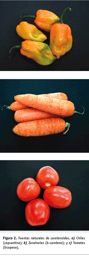 Los vertebrados no pueden sintetizar carotenoides, por lo que dependen de los que ingieren en su dieta para producir sus retinoides, como el retinal (el principal pigmento visual), el retinol (vitamina A) y el ácido retinoico (sustancia que controla el desarrollo embrionario en humanos). El principal precursor de los retinoides es el ß-caroteno, que contiene dos anillos de ß-ionona en los extremos de la molécula (Figura 1). El ß-caroteno es convertido a retinal por medio de la enzima dioxigenasa (Römer y colaboradores, 2000). Otros carotenoides son convertidos a vitamina A por los humanos y son necesarios para el crecimiento y el desarrollo, además protegen contra las cataratas y su insuficiencia en la dieta causa xeroftalmia, ceguera y muerte prematura (Bramley, 2002; Römer y colaboradores, 2000). Algunos carotenoides se distinguen por su protección contra el cáncer, promoviendo respuestas inmunitarias, tanto antioxidantes como fotoprotectoras (Burkhardt y colaboradores, 2001), y evitan la reducción de condiciones crónicas tales como enfermedades cardiacas coronarias y degeneración macular (Römer y colaboradores, 2000).