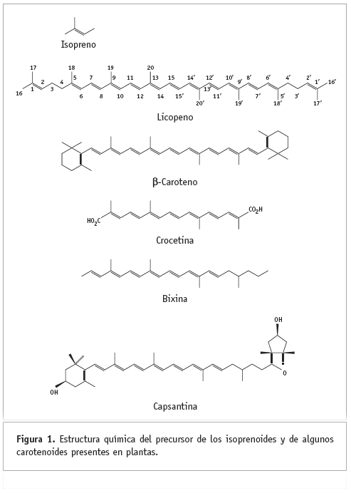 Las plantas producen aproximadamente más de 30 mil diferentes clases de compuestos conocidos como terpenoides o isoprenoides, los cuales están formados por dos, tres o más unidades estructurales de cinco átomos de carbono llamadas isopreno (Figura 1). Muchos de estos compuestos tienen aplicaciones en la manufactura de alimentos, compuestos industriales y farmacéuticos, por lo que el gran número de isoprenoides ofrece un atractivo potencial para la ingeniería genética (Broun y Somerville, 2001). Entre los isoprenoides destacan los carotenoides, los cuales comprenden a los carotenos y a las xantofilas y son producidos por bacterias, algas, hongos y plantas superiores. Aunque existen carotenoides con 30, 45 o 50 átomos de carbono, los de 40 átomos de carbono representan la mayoría de las más de 600 estructuras conocidas; los de origen bacteriano son los más diversos. Estructuralmente, los carotenoides consisten de ocho unidades de isopreno y son hidrocarburos que pueden ser lineales o con anillos cíclicos en uno o en ambos extremos terminales de la cadena hidrocarbonada. Pueden presentar grupos oxo, hidroxi y epoxi en diferentes posiciones (Figura 1). La cadena de poliisopreno consiste de más de 15 dobles enlaces conjugados, y éstos son responsables de sus colores característicos, sus propiedades fotoquímicas y de su acción biológica (Bramley, 1997).