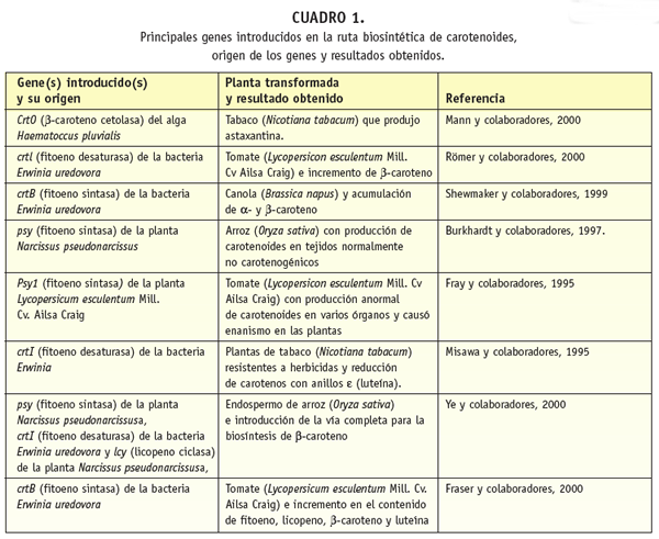 Uno de los logros más espectaculares fue la introducción de la vía completa para la biosíntesis de ß-caroteno en el endospermo de arroz (Oryza sativa). Los granos de arroz carecen de carotenoides, por lo que la manipulación genética para la formación de ?-caroteno en el endospermo del arroz debía incluir al menos cuatro reacciones catalizadas por las enzimas fitoeno sintasa, fitoeno desaturasa, ?-caroteno desaturasa y licopeno ciclasa. La introducción de los genes se realizó con un plásmido que contenía un gen de narciso (Narcissus pseudonarcissus) que codifica para la fitoeno sintasa y el gen que codifica para la fitoeno desaturasa de la bacteria Erwinia uredovora; estas dos enzimas participan en la síntesis del licopeno a partir del geranilgeranil pirofosfato. Ambos genes fueron complementados con las secuencias de tránsito para dirigirlos a los plástidos del endospermo. El gen de la fitoeno sintasa (psy) estuvo bajo el control del promotor de la glutelina específica del endospermo, y el gen bacteriano que codifica para la fitoeno desaturasa (crtI) (que también cataliza la reacción de la ?-caroteno desaturasa) bajo el control del promotor constitutivo 35S del virus del mosaico de la coliflor. Se acumularon carotenoides como luteína, zeaxantina, a y ß-caroteno en lugar de licopeno (Cuadro 1). Para completar la vía biosintética del ß-caroteno se introdujo también el gen de la ß-licopeno ciclasa (lcy) de narciso bajo el control del promotor 35S del virus del mosaico de la coliflor, lo que incrementó los niveles del contenido de ß-caroteno del endospermo de arroz hasta un nivel de 1.6 microgramos por gramo de peso seco (Ye y colaboradores, 2000; Sandmann, 2001b). Se demostró así que es posible la producción de carotenoides en tejidos que normalmente no los producen (Cuadro 1), siempre que se tengan disponibles los precursores (Burkhardt y colaboradores, 1997).