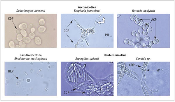 Figura 2. Especies representativas de la Colección de Levaduras Marinas de México del cibnor, pertenecientes a las tres divisiones taxonómicas reconocidas para este grupo de microorganismos. Se indican algunas de las características morfológicas de los grupos: ACP, Ascoespora; BLP, Blastoespora; CDP, Conidioporos; PH, Pseudo-hifa; y SP, Septo.
