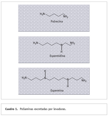 Dos aspectos han motivado la consideración del uso de levaduras como probióticos (benéficos para los seres vivos) en acuacultura: primero, el difundido y probado efecto benéfico de levaduras en diversos modelos, incluyendo al ser humano, y segundo, la demostración de la presencia de levaduras en el tracto digestivo de peces, con una alta capacidad de colonización. Como ejemplo podemos citar a Saccharomyces boulardii, que es ampliamente utilizada en varios países de Europa en el tratamiento de enteritis infecciosa aguda o en los desordenes producidos por el uso de antibióticos (Mcfarland, 1993). Se han descrito diversos mecanismos del efecto benéfico de las levaduras, y entre otras cosas se sugiere que la expresión de enzimas intestinales es favorecida por las poliaminas (Cuadro 1) secretadas por el organismo. En peces, por ejemplo, la diferenciación y maduración del tracto digestivo durante el desarrollo larvario ha recibido especial interés, en respuesta a la creciente demanda de optimizar sistemas de crianza (Tovar, 2002).