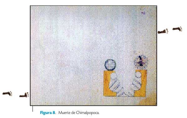 Sin embargo, páginas más adelante, el mismo tlacuilo decide usar un estilo mesurado, discreto y muy moderado, como el de la página 31 (fig. 8), en la que aparece Chimalpopoca muerto, amortajado y frente a otro personaje también muerto de identificación desconocida.
