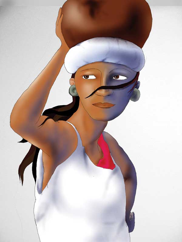 a) Descripción: Este elemento está conformado por un conjunto de líneas mixtas delineadas en color negro con coloración de la superficie con técnica de aguada, que representan una figura humana femenina.