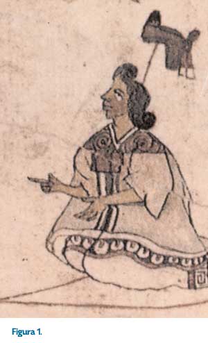 Asumimos que se trata de doña Isabel Moctezuma, y que de acuerdo con lo que se sabe, ella fue hija legítima del emperador y la emperatriz Teizcalco. En nombre de Carlos V recibió en 1523 la encomienda de Tacuba, por ser considerada heredera del señor de México, y fue colmada de grandes privilegios, donde este cacicazgo pasó a sus hijos varones para posteriormente pasar a una mujer, doña María Cano Moctezuma. Doña Isabel fue la mujer del conquistador Alonso de Grado (Alvarado) (Figura 1).