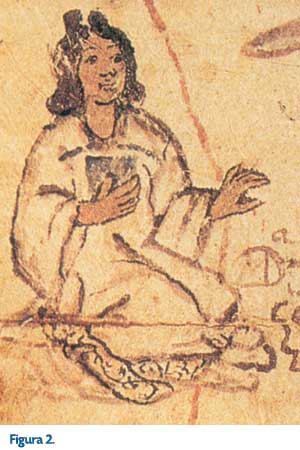 De esta imagen podemos destacar que ya se muestra claramente influida por las convenciones españolas; no hay énfasis en la indumentaria y a la plasticidad nahua se le resta importancia. La nueva organización colonial está presente (Figura 4).