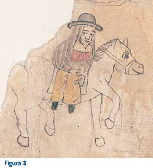 La tercera pictografía muestra otra escena de una mujer cacica; la encontramos registrada en el Códice Azcatitlan, lámina xxix. Como podemos ver, es una mujer montada según la costumbre de su sexo; lleva un sombrero y un manto en la cabeza. No se puede saber si es casada, pero muy probablemente era una mujer noble, por ir montada a caballo (derecho de las cacicas). Cabe destacar que va ataviada por ropas ya no tan tradicionales, como el huipilli, además de llevar zapatos negros. Los demás detalles de esta escena se refieren a: “...una procesión de personas a caballo... Más abajo y en la esquina izquierda, una mujer les acompaña, montada según la costumbre de su sexo.” De esta imagen podemos mencionar que las formas ya revelan una fuerte influencia española, donde no sólo se ve el cambio en los trazos sino también las nuevas temáticas, producto del aparato administrativo colonial (Figura 3).