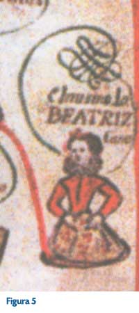 Finalmente tenemos una quinta imagen, del manuscrito 233 que se encuentra en la Biblioteca Nacional de Francia (este material forma parte del Proyecto Amoxcalli del CIESAS DF-Conacyt, a cargo de la doctora Luz María Mohar Betancourt), donde nos muestra un detalle de la descendencia de la familia Moctezuma Cano. En ella podemos ver cómo se va modificando la manera de representar a las mujeres, y como detalle podemos ver a la infanta Beatriz Cano con un estilo muy distinto en su manera de vestir e incluso en su peinado (Figura 5).