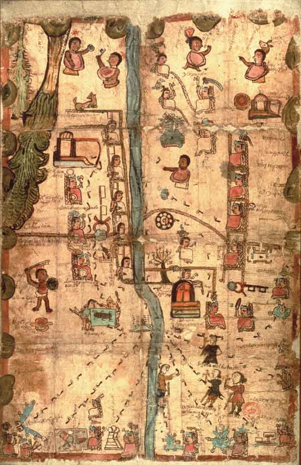 Cuando se observa el códice por primera vez lo primero que se identifica es un río que lo divide verticalmente por la mitad. A ambos lados de la corriente de agua se encuentra una línea genealógica con una serie de señores sentados en sus tepotzoicpalli (asientos con respaldo), lo que indicaría su alta jerarquía. Al parecer, las cuerdas que unen a los señores que se localizan a la derecha del río fueron dibujadas en una época posterior y los personajes estaban originalmente sueltos, es decir, no los unía un mecate. Todos estos personajes portan su antropónimo, es decir, su nombre anotado pictográficamente.