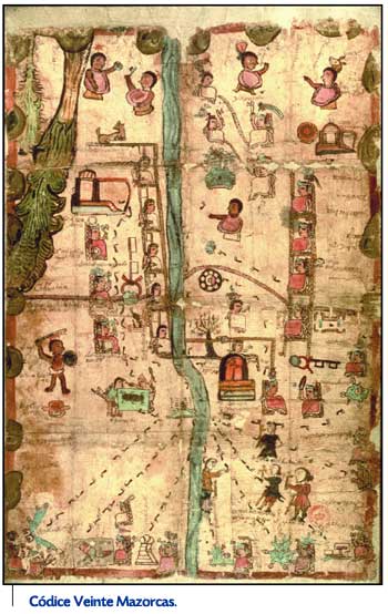 De Veinte Mazorcas parten y regresan huellas, al igual que en otras partes del documento, indicando movimiento de personas de un lugar a otro o representando sus caminosUn poco más abajo están representados una serie de personajes unidos por una cuerda atada a la mano derecha. Se trata de cautivos que tienen una banderita en la cabeza indicando con este numeral que se trata de veinte cautivos. Este glifo es un elemento diagnóstico en los códices mixtecos para representar a los que iban a ser sacrificados.(1)