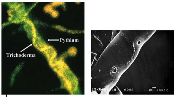 Las cepas de Trichoderma son consideradas como de los más efectivos biofungicidas ya que pueden antagonizar un amplio espectro de hongos fitopatógenos gracias a la producción de enzimas líticas que degradan las pare-des celulares del patógeno provocando su muerte. La fotos muestran: a) el ataque de Trichoderma harzianum (naranja) contra el fitopatógeno Pythium ultimum (verde), el cual se observa invadido; b) aspecto de la superficie perforada de Rhizoctonia solani después de remover las hifas de Trichoderma. Fotos cortesía de: a) J.P. Hubbard; American Phytopathological Society; b) I. Chet, Hebrew University of Jerusalem.