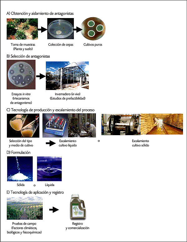 En consecuencia, el desarrollo de productos exitosos para el control biológico de plagas o patógenos requiere de la participación de un grupo multidisciplinario conformado por especialistas en fitopatología, entomología, agronomía, microbiología, biología molecular e ingeniería de bioprocesos. Antes de que un agente de control biológico sea introducido con éxito en el mercado es indispensable llevar a cabo una serie de evaluaciones. Después de la selección inicial en laborato rio de un aislado microbiano que sea eficaz, es importante estudiar su ecología, fisiología y modo de acción. Paralelamente, debe desarrollarse un sistema de producción y formulación del agente de control biológico para obtener un producto con una vida de anaquel suficientemente alta y que otorgue al producto ventajas competitivas en el ambiente en el cual será aplicado. Posteriormente, se debe escalar el proceso a nivel piloto para la obtención de cantidades de producto suficientes para llevar a cabo su evaluación en invernadero y campo. Finalmente, si el producto presenta atributos suficientes y su producción es viable tanto técnica como económicamente, se lleva a cabo el registro y se inicia la comercialización del producto.