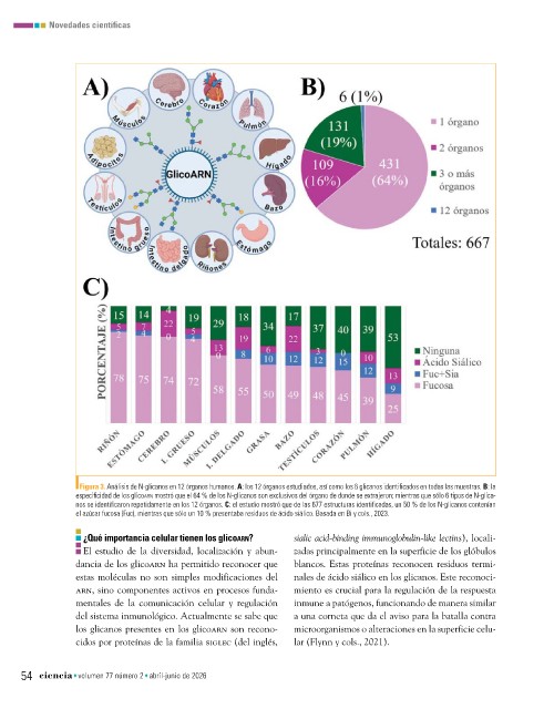 especificidad de los glicoarn mostró que el 64 % de los N-glicanos son exclusivos del órgano de donde se extrajeron; mientras que sólo 6 tipos de N-glica-