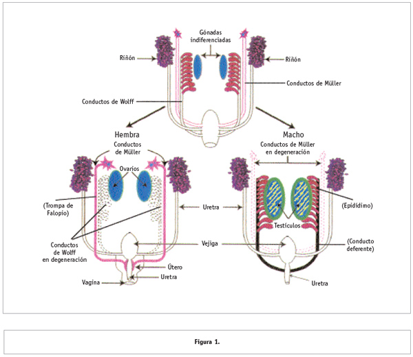 El conducto de Wolff y el conducto de Müller se desarrollan tanto en embriones hembra como en macho; sin embargo, dependiendo del tipo de gónada que se forme, uno de los dos conductos desaparece. En machos, la hormona antimülleriana producida por las células de Sertoli en el testículo provoca la degeneración de los conductos de Müller. Por otro lado, la testosterona producida por las células de Leydig promueve el desarrollo y masculinización de los conductos de Wolff. En hembras, los conductos de Wolff se degeneran por la ausencia de testosterona mientras que los de Müller se mantienen, ya que no hay producción de hormona antimülleriana (Figura 1).