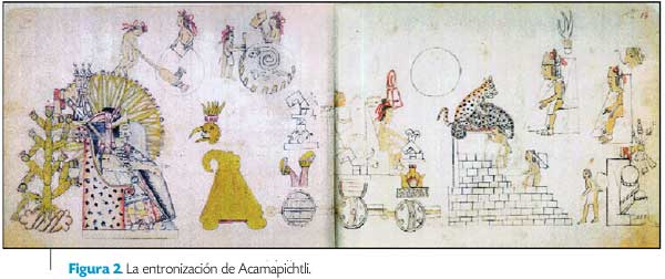 La primera escena de esta segunda parte (Figura 2) se centra en la entronización formal de Acamapichtli, como símbolo de la autonomía del señorío tenochca. Se trata de una lámina muy bien lograda en la que sobresale la majestad de Acamapichtli, presentado con todos los atributos reales; está en posición sedente sobre un icpalli cubierto con piel de ocelote y ataviado con toda propiedad; lleva su taparrabos o maxtlatl, calza sandalias o cactli y lleva una tilma diseñada con rostro y garras diabólicas, a la manera europea. Cubre su cabeza con una diadema o copilli propia de su jerarquía, y lleva el pelo en forma de temillotl, anudado en la parte superior de la cabeza, como acostumbraban los guerreros tenochcas; lleva asimismo un bastón de mando en la mano izquierda, y con la derecha marca una actitud autoritaria; a manera de alhajas, usa nariguera y ajorcas en las piernas.
