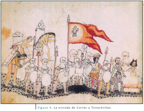 Una tercera sección, a la que doy el nombre de “Nueva España”, comprende información referente a la llegada de los españoles al valle de México en 1519. Como es de todos conocido, la presencia europea en el Anáhuac provocó una verdadera revolución política, económica y cultural, lo que se refleja en esta parte del Códice Azcatitlan (Figura 4), formada por seis escenas, la primera de las cuales narra el momento inicial en el que se encuentran Cortés y Moctezuma (aunque la parte de Moctezuma está perdida). Se trata de una bellísima lámina en la que aparecen los siguientes personajes: