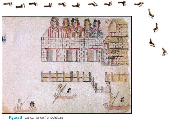 La cuarta escena (Figura 5) muestra una vista seguramente de Tenochtitlan, en la que aparecen cuatro grandes damas, lujosamente ataviadas, mirando desde la azotea de sus casas, mientras que otras tres, acompañadas por sus criados, navegan en canoas, posiblemente en actitud de huida.