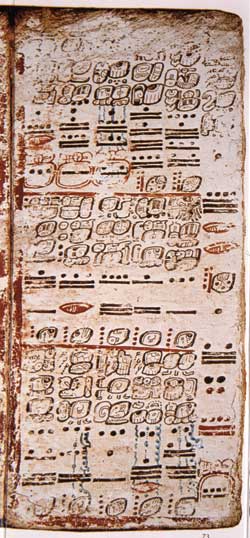 La tarea de los escribas comenzaba delimitando el espacio de cada lámina con una gruesa línea de color ocre-rojizo. Si bien es claro que esta especie de marco que presenta la mayoría de las páginas de los libros mayas tiene una función estética, pienso que además tenía un sentido simbólico. Creo era el de demarcar el espacio en el que más tarde se registraría el lenguaje sagrado de los dioses. Es, a mi modo de ver, semejante al de la delimitación espacial que se realiza durante un ritual, con el fin de dividir el espacio profano del sagrado. A continuación, el escriba dividía cada lámina, ya fuera mediante dos líneas o tres, en sentido horizontal, y calculaba el número de láminas que cada texto requeriría. Desconozco los criterios que seguían para determinar el tamaño de un texto. Hay algunos que abarcan en sentido horizontal más de dos páginas; otros, en cambio, abarcan apenas una columna. Así, la lectura de la mayoría de los almanaques en este códice se efectúa de izquierda a derecha y de arriba abajo.