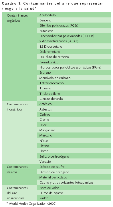 Hasta el momento hay 188 contaminantes en el aire reportados por la Agencia Ambiental Estadounidense (U.S. Environmental Protection Agency) como tóxicos: se sabe o sospecha que causan cáncer u otros efectos serios en la salud humana y ambiental. De ese listado, la Organización Mundial de la Salud informa que se han evaluado riesgos a la salud en 35 de ellos, que son monitoreados en las ciudades de mayor desarrollo y calidad de vida. Estos contaminantes se presentan en el Cuadro 1.