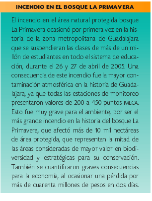 Haciendo una evaluación de las fuentes de las partículas contaminantes de la atmósfera de Guadalajara durante 2005, siguiendo la metodología de valoración rápida desarrollada por Economopoulos (1993), se han identificado diversas emisiones que representan un total anual de un millón 395 mil toneladas. De éstas, el mayor porcentaje (90 por ciento) tuvo como origen los incendios forestales ocurridos del 23 al 28 de abril de 2005 en el área natural protegida La Primavera, ubicada al poniente de Guadalajara, y los incendios en la montaña Tequila, 40 kilómetros al noroeste, que se quemó en mayo del mismo año.