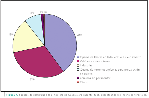 El resto de fuentes de contaminantes, que son las que año con año aportan partículas a la atmósfera de Guadalajara son las presentadas en la Figura 1: las principales son la quema de llantas en más de 50 ladrilleras o en tiraderos a cielo abierto y las emisiones de un millón 16 mil 508 unidades automotoras que conforman el parque vehicular registrado en 2005 en la zona metropolitana de Guadalajara, y más 200 mil unidades que constituyen el parque flotante. Además, son fuentes importantes las emisiones de la industria (cementeras, fundidoras, etcétera) y la quema de terrenos agrícolas de los alrededores de la ciudad que utilizan el fuego como parte de una tecnología para la limpieza previa a la preparación de terrenos para cultivo o para la cosecha de la caña de azúcar. En menor proporción, pero también identificadas como fuentes de partículas, están los caminos sin pavimentar de los asentamientos irregulares que rodean Guadalajara, los bancos de material, las diversas obras de ingeniería y construcción, la erosión de los suelos y las cenizas volcánicas aportadas por las erupciones del Volcán de Fuego, en Colima.