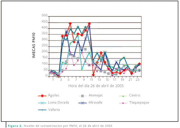 Tomando en cuenta las concentraciones de PM10 que se presentan cotidianamente en la zona metropolitana de Guadalajara, se puede concluir que una significativa porción de la población de la ciudad está expuesta a concentraciones superiores a los 150 microgramos por metro cúbico, principalmente en localidades ubicadas al sur y oriente de la ciudad, como Miravalle y Loma Dorada, donde se excede la norma de calidad todos los meses del año. En contaminación por partículas PM10 Guadalajara es, después del Distrito Federal, la ciudad con mayores niveles de contaminación, con 111 días al año fuera de norma.