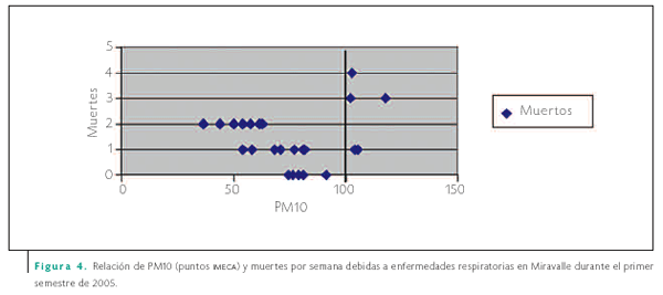 Otro análisis realizado fue la asociación de niveles de contaminación por PM10 y la mortalidad en Miravalle. Los resultados obtenidos en 2005 nos muestran que en promedio mueren por enfermedades respiratorias cuatro personas al mes. Para mayo de 2005 se duplicó esta cifra, con lo cual se alcanzó el máximo nivel en todo el primer semestre. En términos de la asociación de estas muertes y las concentraciones de PM10, se encontró que cuando se tienen en promedio por semana más de 100 puntos imeca de PM10 existe una probabilidad del 83 por ciento de que muera a la siguiente semana algún habitante por enfermedades respiratorias, y un 67 por ciento de probabilidad de que muera más de una persona, mientras que por abajo de los 100 puntos imeca la probabilidad de que muera más de una persona es de menos del 40 por ciento (Figura 4).