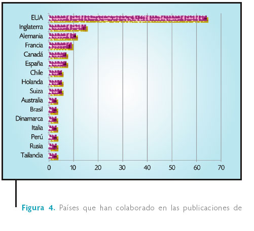 Uno de los aspectos importantes en la publicación de estos trabajos puede ser obtenida del dato de las colaboraciones de los científicos mexicanos con sus colegas en otros países. En la Figura 4 se observan estas colaboraciones cuando se produjeron más de tres trabajos publicados. Se observa una abrumadora colaboración con los Estados Unidos de América. Este resultado muestra la gran dependencia de los trabajos de investigadores en México de la ciencia desarrollada en los Estados Unidos de América. Este país aparece en más del 50 por ciento de los artículos publicados por mexicanos, situación que es más del triple de cualquier otro país. (Para este conteo se toma en cuenta la aparición del país en la dirección de los artículos.) Sorprende la colaboración con Tailandia, que aparece con algún investigador coautor en más de tres artículos.