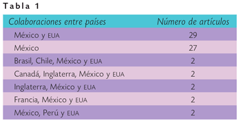 Los aspectos de colaboraciones entre un grupo de países son también importantes. En la Tabla 1 se observan los grupos de países que tienen más de dos artículos en colaboración. Es de hacerse notar que el mayor número de colaboraciones se da entre los Estados Unidos de América y México; de hecho, es mayor el número de colaboraciones con ese país que con cualquier otro incluyendo al propio México. Otro punto es que los artículos publicados solamente por investigadores con dirección en México ocupa el segundo lugar, y representa más del 25 por ciento de las publicaciones en estas revistas. Fuera de esos dos grupos los datos caen dramáticamente a dos o menos artículos en colaboración por grupo de países. En estos 110 artículos participaron investigadores radicados en 41 países diferentes.