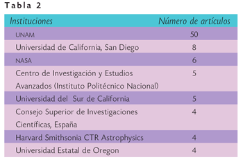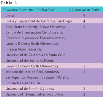 En la Tabla 3 se pueden observar las colaboraciones entre instituciones que produjeron más de un artículo en estas revistas en este periodo de tiempo. En la tabla se muestran las colaboraciones con al menos dos trabajos publicados. Aquí destaca la colaboración entre la Universidad Nacional Autónoma de México y la Universidad de California en San Diego. También se observa que la UNAM es la única institución mexicana que produjo, durante este periodo de tiempo, más de un artículo en estas revistas sin colaboración de otra institución, sea mexicana o extranjera. Esta tabla y la Figura 2 indican que no existe en México un cúmulo de trabajo científico que produzca resultados publicables en estas revistas de forma al menos anual; esta afirmación se sustenta en que la correlación entre las nueve publicaciones de Lazcano y la UNAM no es completa.