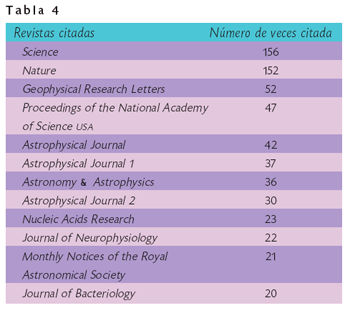 De la base de datos del Institute for Scientific Information se puede obtener otro resultado sobre el número de referencias que utiliza un trabajo realizado por investigadores que laboran en México y que fue publicado en Nature o Science. En la Figura 6 se nota que estos artículos tienen en su mayoría menos de cuarenta referencias, y que más de 30 de ellos usaron menos de 10 referencias para fundamentar su tabajo. De estas referencias, la mayoría de ellas fueron a las propias revistas Nature y Science, como se ve en la Tabla 4. En esta tabla solamente se presentan revistas que recibieron más de 20 citas. De la Tabla 4 se observa que tres revistas de las más referidas son multidisciplinarias, cinco de astronomía y una de geofísica, neurofisiología, genética y bacteriología. De esta tabla se pueden inferir los principales tópicos de las investigaciones analizadas en este trabajo. El total de revistas citadas en los 110 artículos es de 863, lo que manifiesta una gran diversidad de lectura de material científico y reafirma el hecho que hay una dispersión de temas.