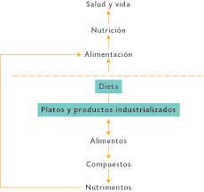 Nutriólogo: El diagrama muestra que la nutrición es una de las bases de la vida y la salud, y que en parte es resultado de la alimentación. Ésta consiste en la ingestión de la dieta, la cual está conformada por alimentos, platillos y productos industrializados, que se ingieren porque contienen compuestos cuya digestión libera los nutrimentos necesarios justamente para mantener la salud y la vida.